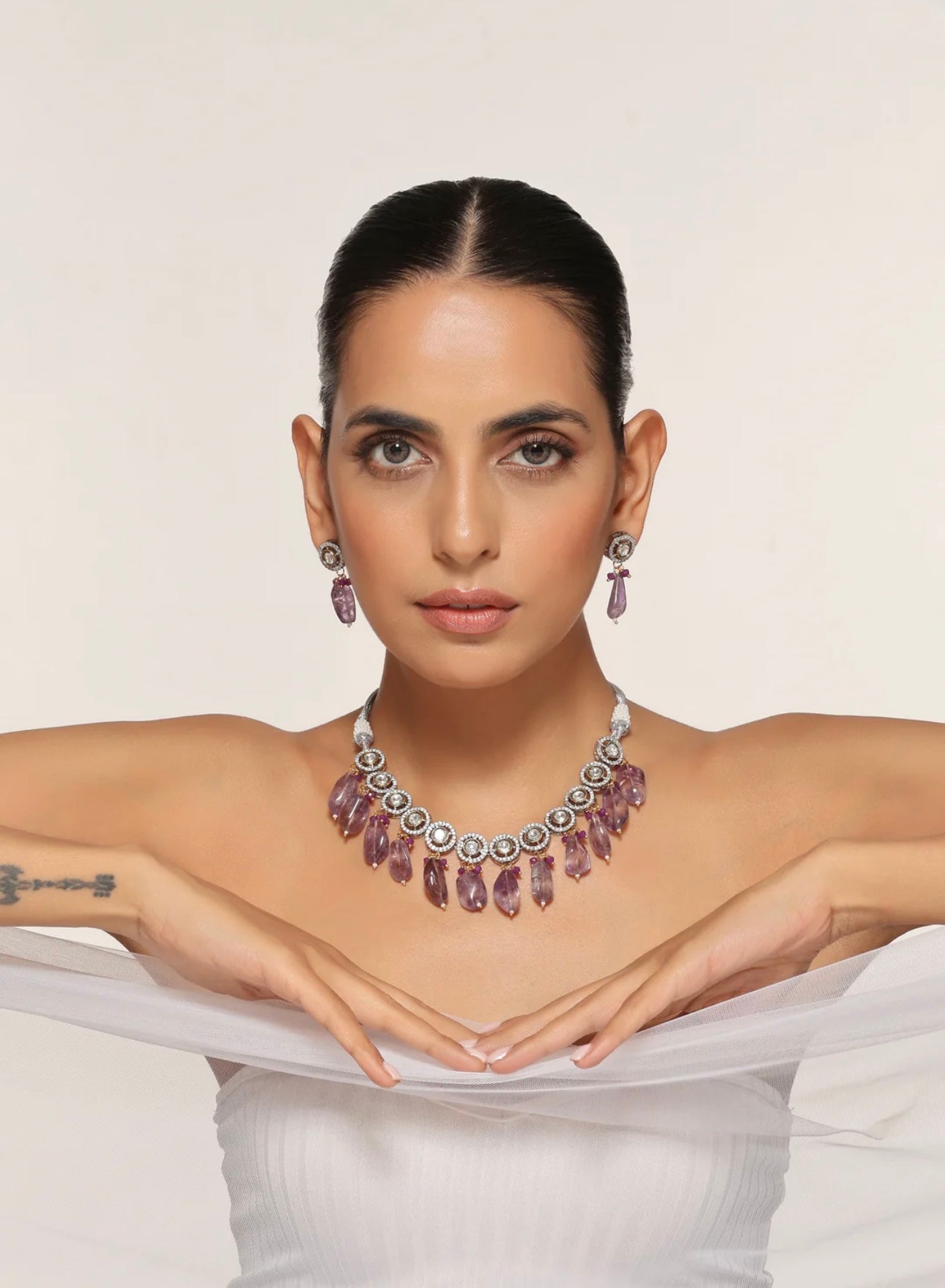 Experience the epitome of luxury with our exquisite floral polki necklace. This elegant piece showcases intricate, handcrafted details and is adorned with stunning polki and sparkling cubic zirconia. The traditional touch of beautiful colour adds a timeless charm, while the delicate fluorite stones enhance its modern allure. Elevate any ensemble with this refined treasure.