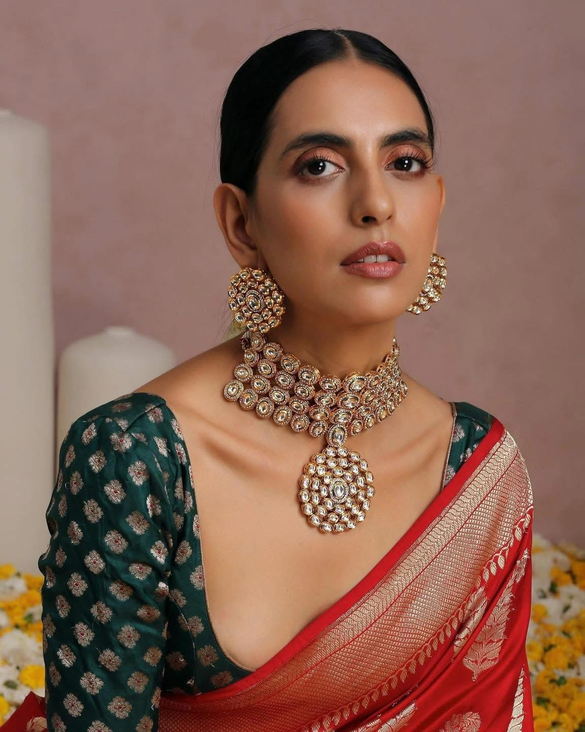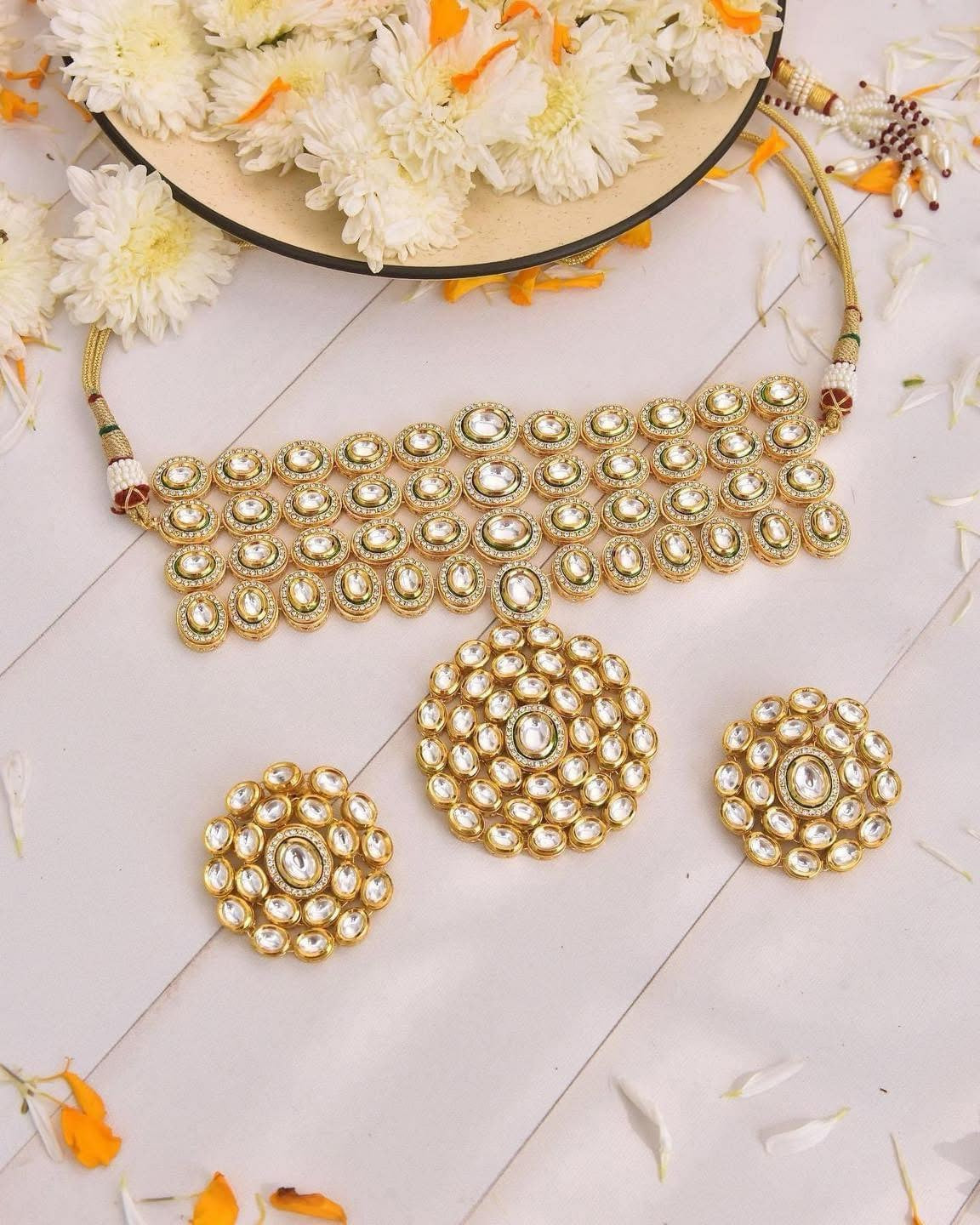 The ππ ππ’ ππ€π‘π π ππππ π‘πππ πππ© features a statement choker adorned with premium Polki stones arranged in an intricate, symmetrical pattern. The design blends traditional craftsmanship with a modern aesthetic, highlighted by a soft enamel base. The set includes matching earrings shaped like blooming floral fans, mirroring the necklaceβs ornate detailing. Finished with a gold-toned adjustable thread, the set exudes elegance, perfect for festive or wedding occasions.