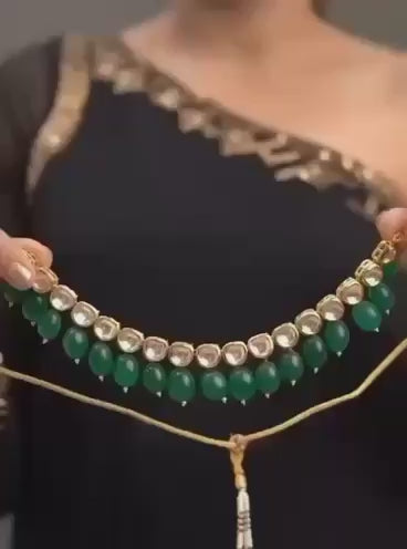 Rambia Green Kundan and Pearl Necklace Set. Every piece of jewellery tells a story and this chunky Kundan and pearl necklace and earrings set is a tale of contemporary sophistication. Get ready to make a bold statement every time you wear this masterpiece. And, as we know, luxury comes in many forms but this set is the perfect example of luxury at its finest. Made with high-quality Kundan stones and pearls, it is designed with completely versatile details to grant it a precious appeal only for you.