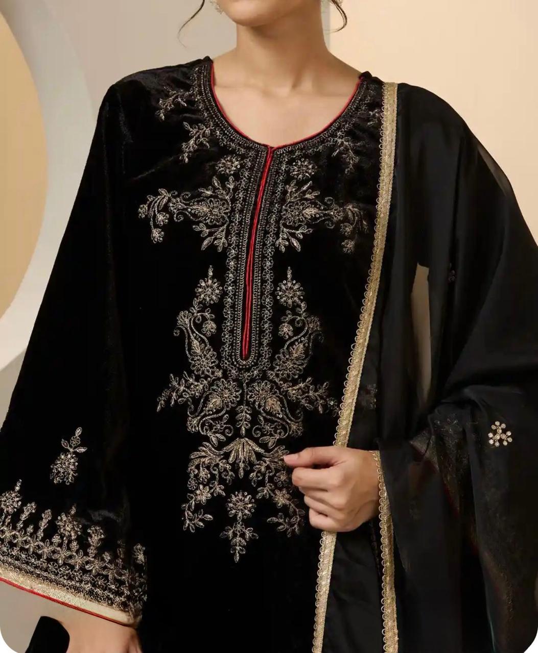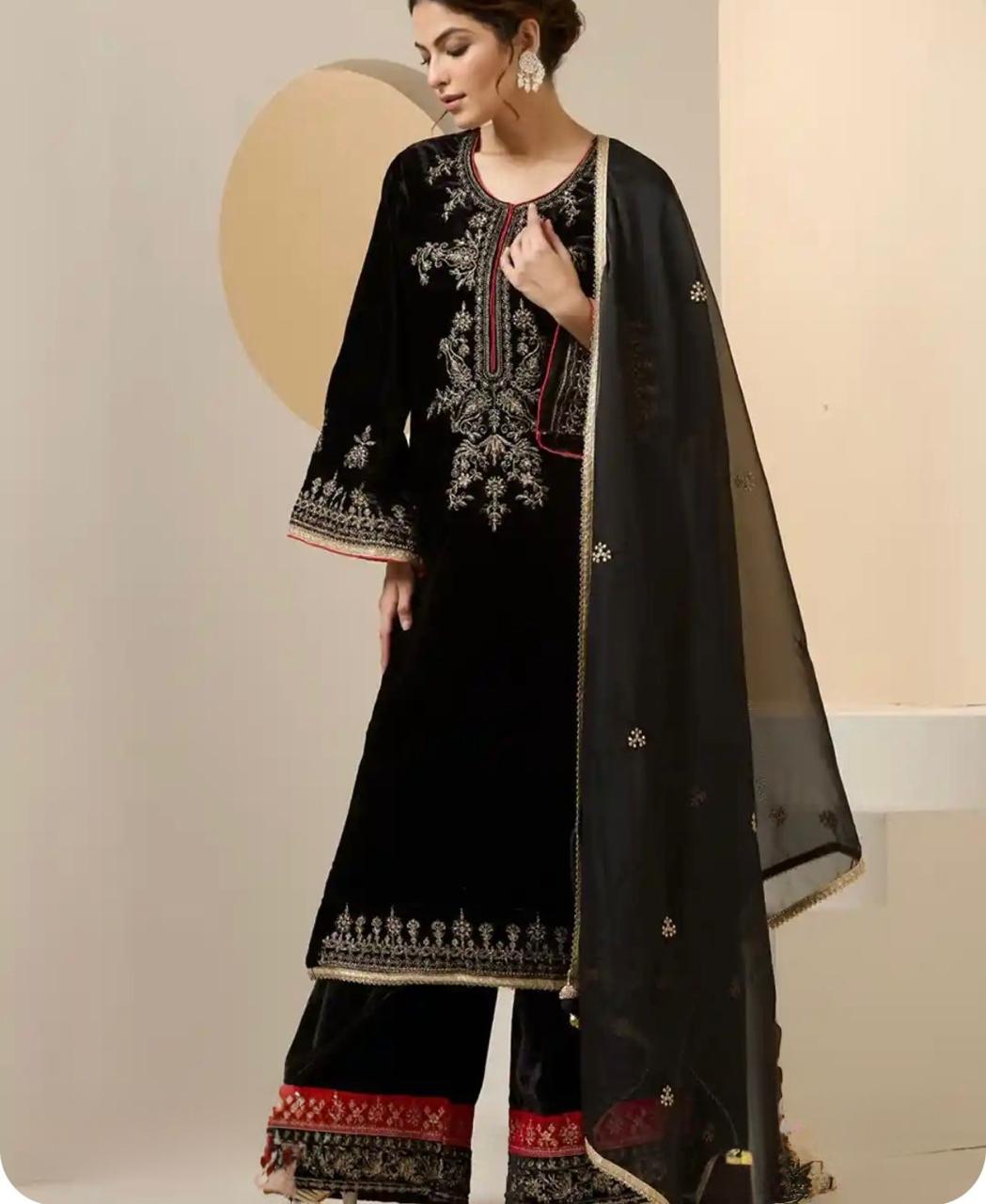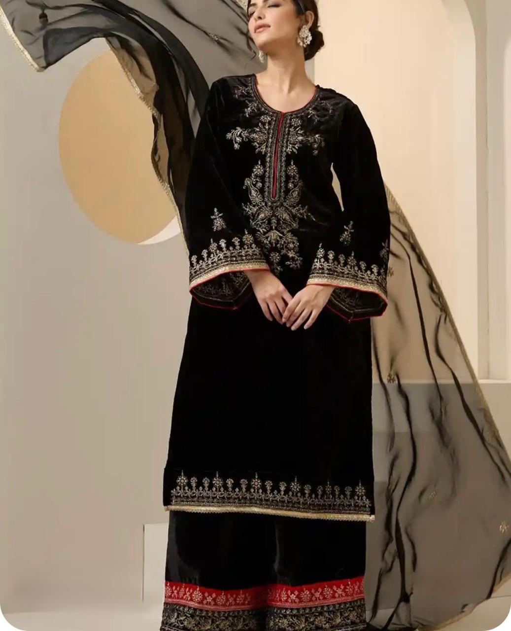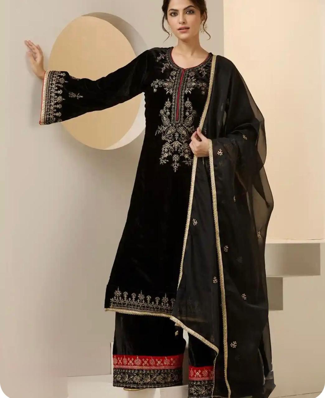Step into elegance with these dark toned salwar kameez sets designed to radiate festive charm and royal glow. Crafted on soft velvet, it features intricate golden zari and thread embroidery across neckline, sleeves and hem.