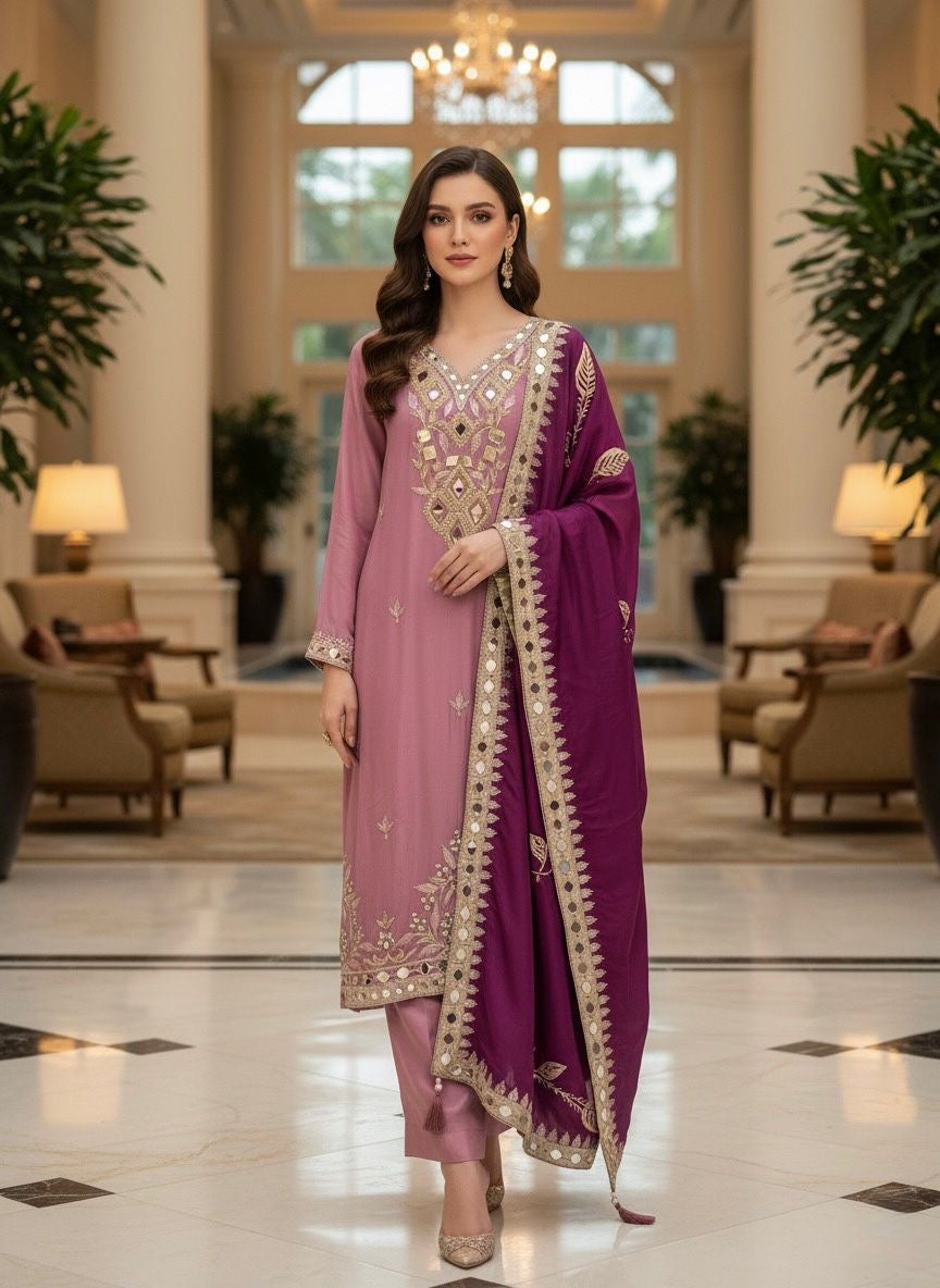 Step into timeless elegance with this beautiful ethnic suit featuring heavy handwork embroidery and mirror embellishments.