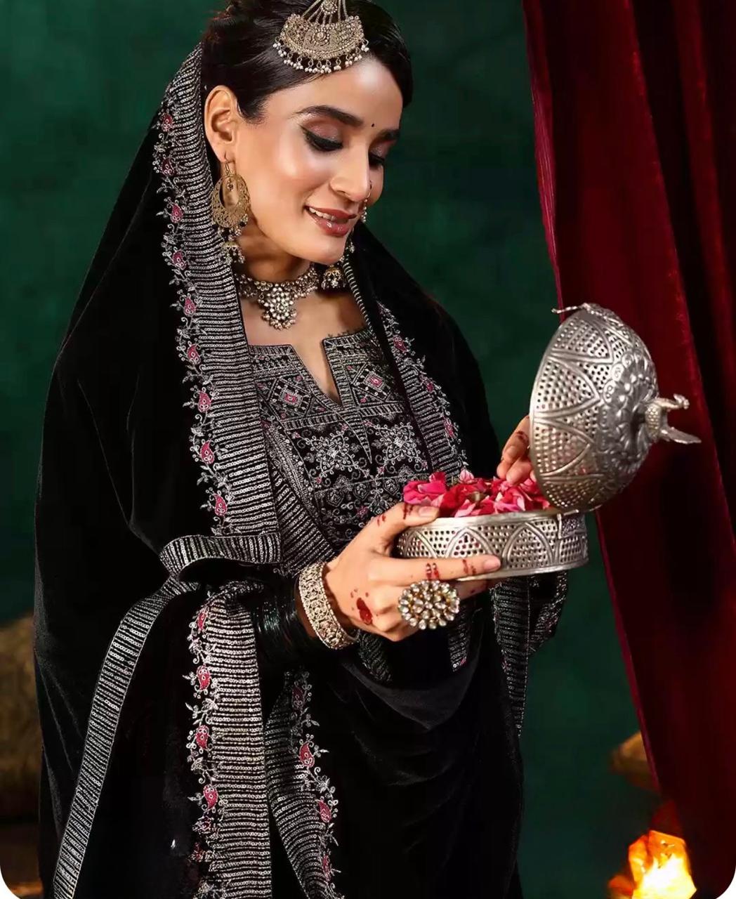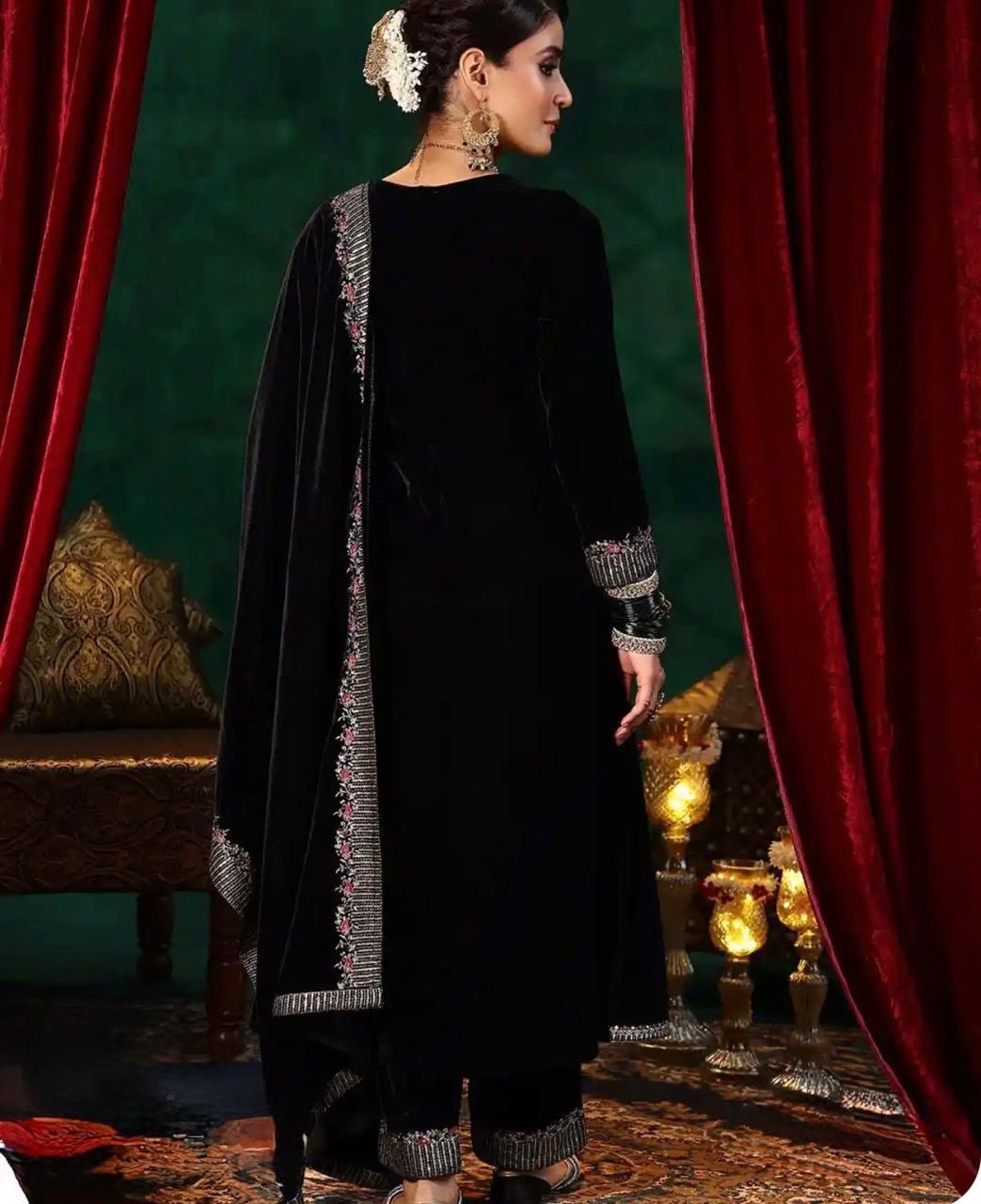 Step into elegance with these dark toned salwar kameez sets designed to radiate festive charm and royal glow. Crafted on soft velvet, it features intricate golden zari and thread embroidery across neckline, sleeves and hem.