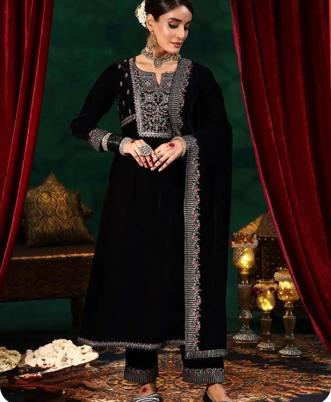 Step into elegance with these dark toned salwar kameez sets designed to radiate festive charm and royal glow. Crafted on soft velvet, it features intricate golden zari and thread embroidery across neckline, sleeves and hem.